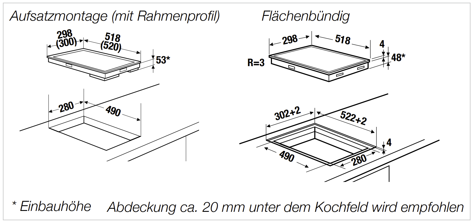 Einbauhöhe 53 mm - Ausschnittmaße B x T ca. 280 x 490 mm
