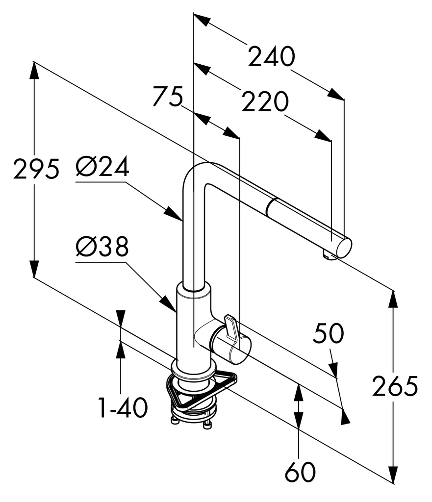 Einhebelmischer. Mit schwenk-/herausziehbarem Auslauf, seitlichem kurzem Hebel, Keramikkartusche und Laminarstrahlregler.
