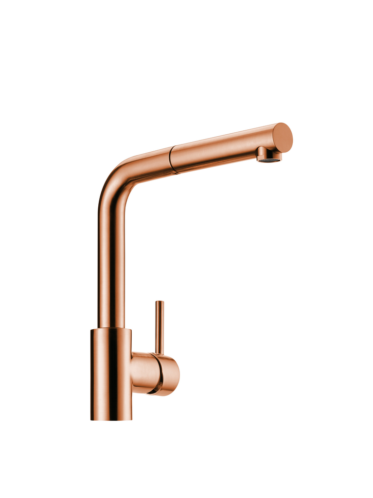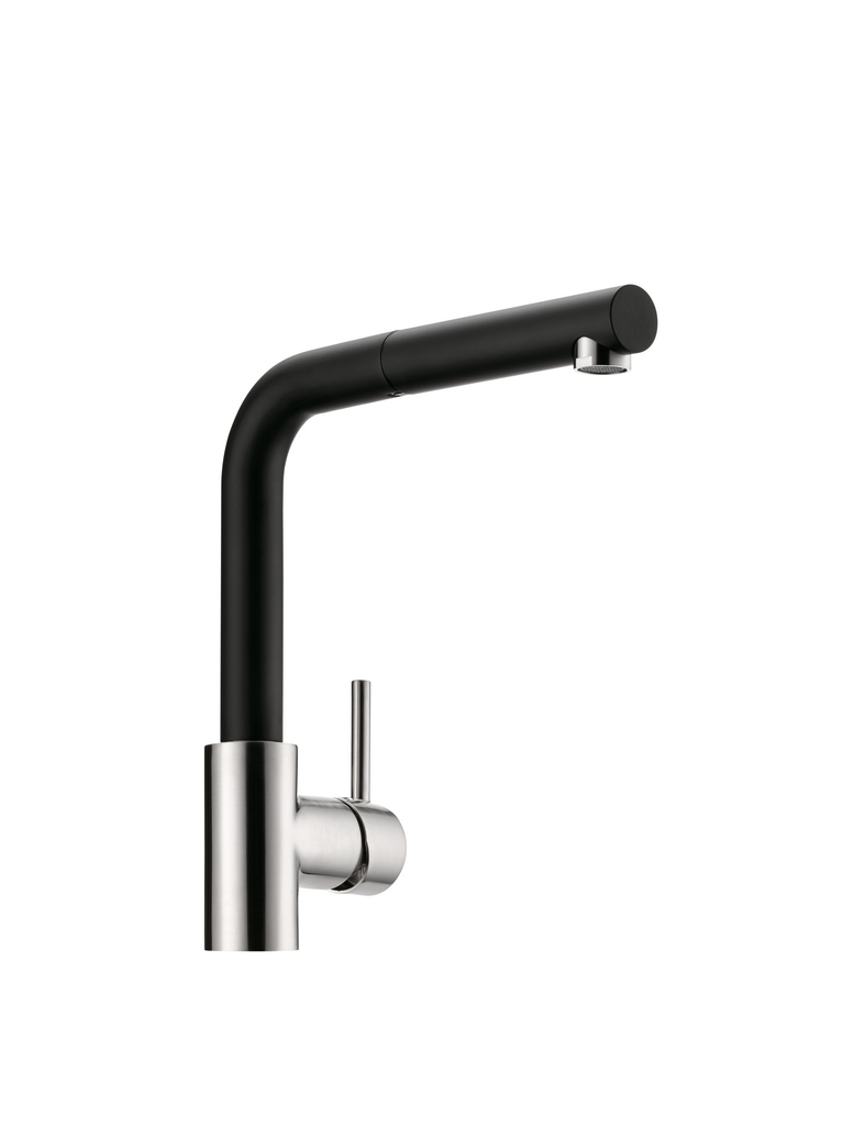 • Einhebelmischer mit schwenk-/herausziehbarem Auslauf, seitlichem Hebel und Keramikkartusche