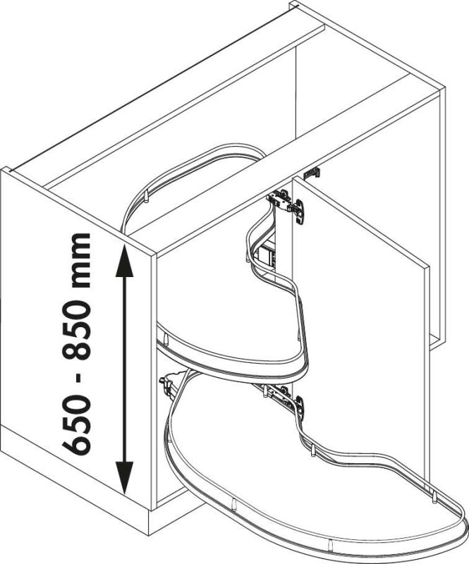 Eckschrank-Schwenkbeschlag zur Aufnahme von Tablaren.