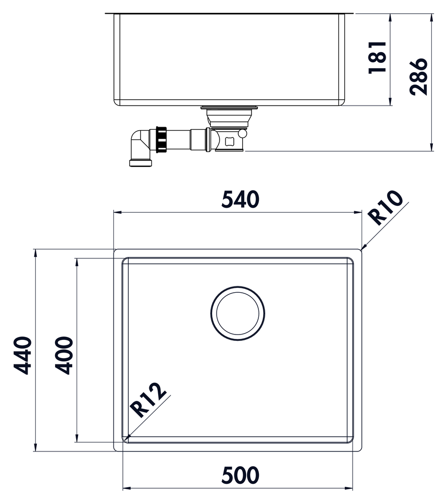 Einbau-/Unterbauspüle. Einzelbecken. 3½" Ab- und Überlaufgarnitur. Bei Verwendung der mitgelieferten Befestigungsklammern vergrößert sich die benötigte Einbaubreite je Seite um ca. 30 mm bei der Unterbauspüle.
