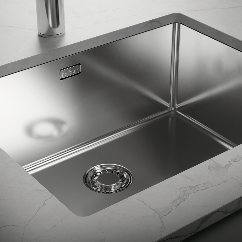 Einbau-/Unterbauspüle. Einzelbecken. 3½" Ab- und Überlaufgarnitur mit bodenbündigem Siebkorbventil. Bei Verwendung der mitgelieferten Befestigungsklammern vergrößert sich die benötigte Einbaubreite je Seite um ca. 30 mm bei der Unterbauspüle.