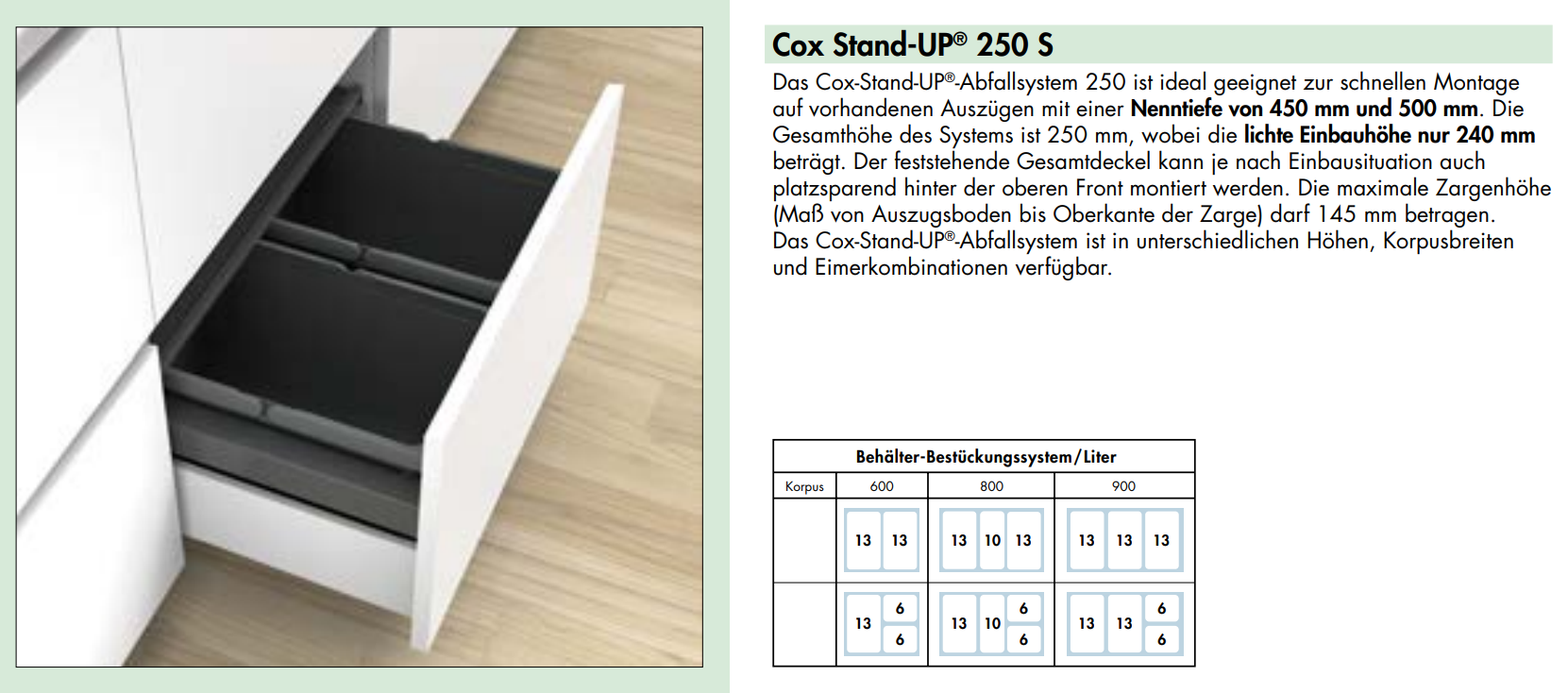 maximalen Zargenhöhe (Maß von Schubladenboden bis Oberkante der Zarge) 145 mm