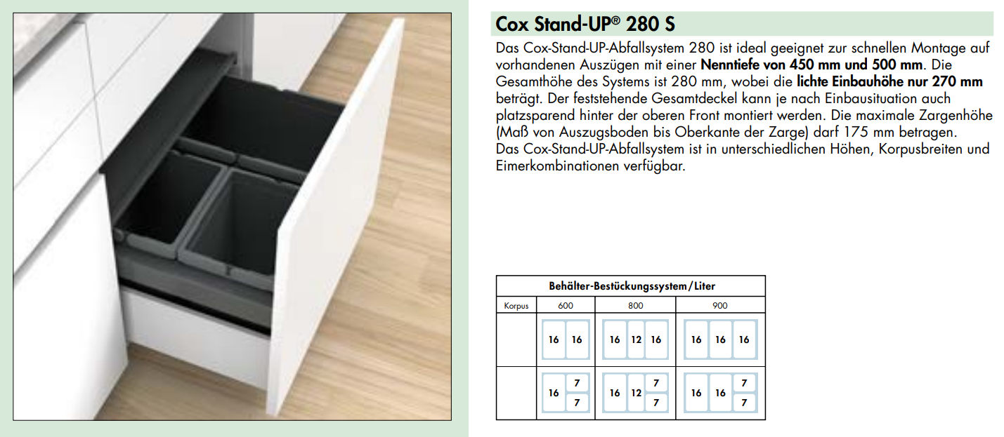 maximalen Zargenhöhe (Maß von Schubladenboden bis Oberkante der Zarge) 175 mm
