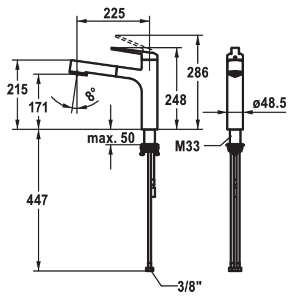 Edelstahl-Einhebelmischer. Mit schwenk-/herausziehbarer Schlauchbrause (Strahl/Brause umstellbar) und Keramikkartusche.