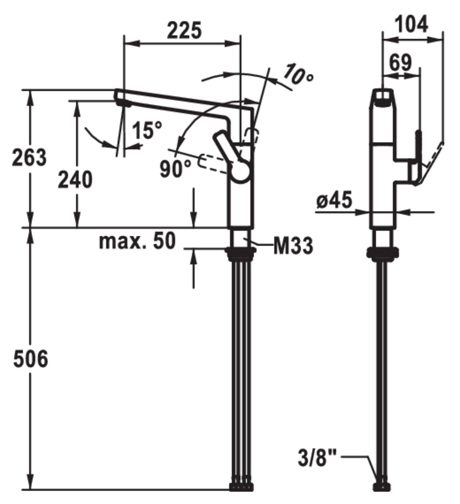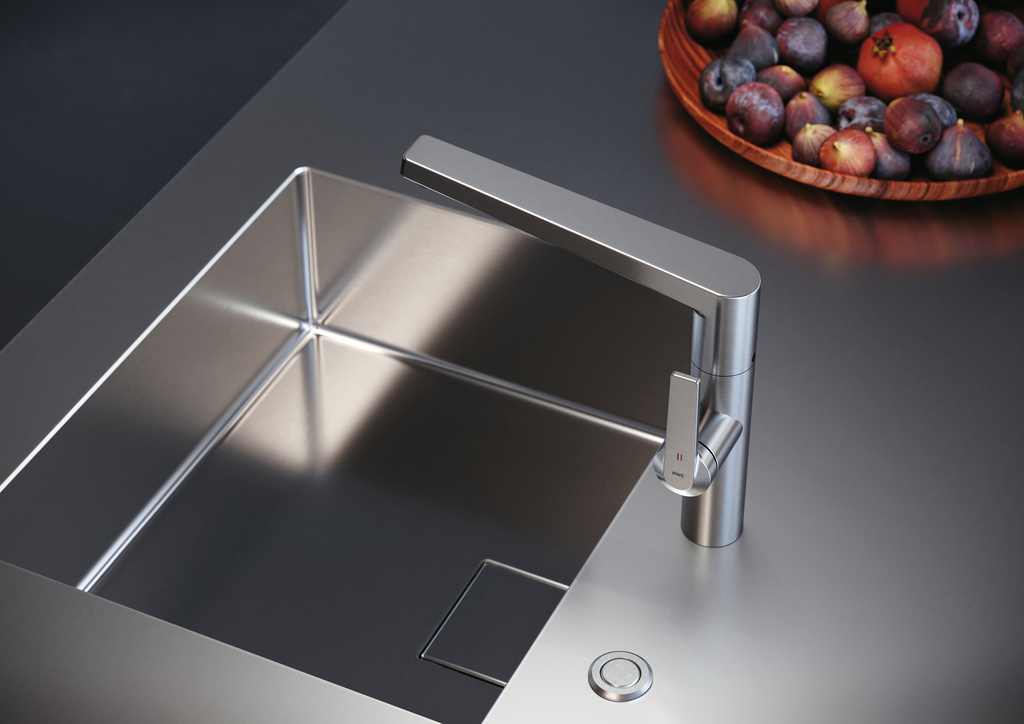 Edelstahl-Einhebelmischer. Mit schwenkbarem Auslauf, seitlichem Hebel und Keramikkartusche.