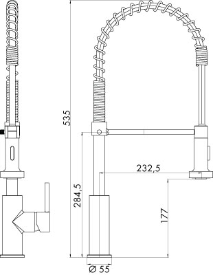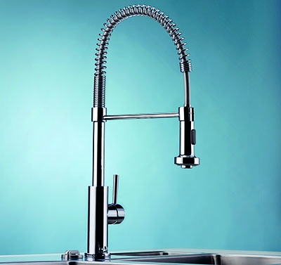 - Einhebelmischer. Mit seitlichem Hebel, mit in einer Spiralfeder geführten 2-Strahl-Handbrause und Keramikkartusche.