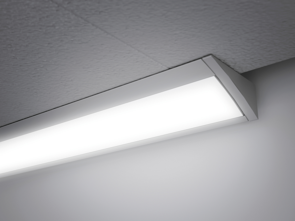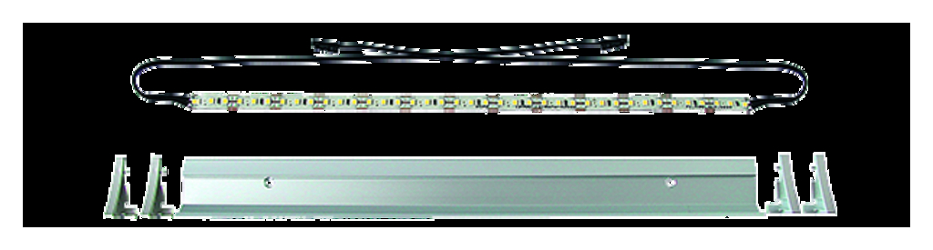 Rückwandleuchte. Aluminiumprofil, edelstahlfarbig, transluzente Kunststoffabdeckung, leicht schräg gestellt für eine optimale Ausleuchtung der Küchennische, einfache Montage unter dem Hängeschrank.
