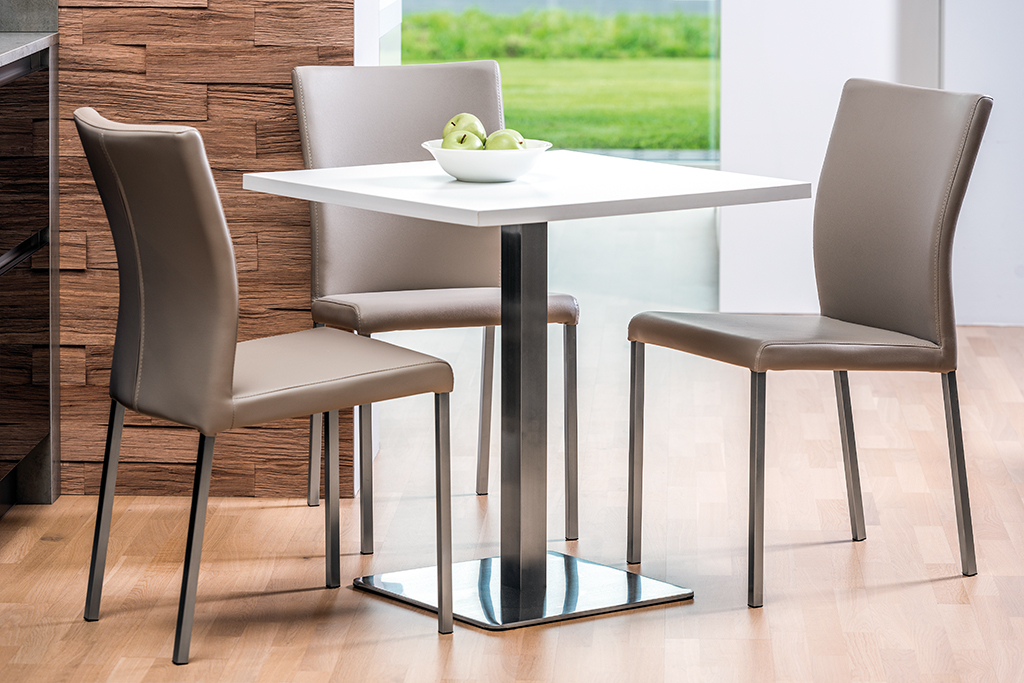 Die solide quadratische Grundplatte bietet die Basis für individuelle Tischlösungen auf kleinstem Raum. Auf der soliden Edelstahlsäule mit Befestigungskreuz können Tischplatten verschiedenster Materialien bis zu einem Maß von max. 800 x 800 mm befestigt werden.