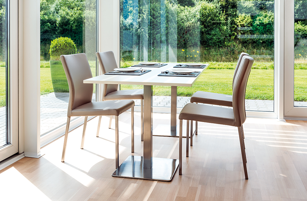 Gliera-Gestelle aus Edelstahl bzw. mit schwarz matter Oberfäche bestechen durch die schlichte Eleganz einer fein geschliffenen Oberfläche. Individuelle Tischlösungen für jeden Einsatzzweck.