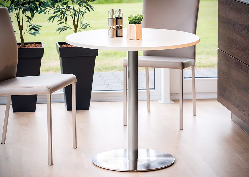 Die solide runde Grundplatte bietet die Basis für individuelle Tischlösungen auf kleinstem Raum. Auf der soliden Edelstahlsäule mit Befestigungskreuz können Tischplatten verschiedenster Materialien bis zu einem Durchmesser von max. 900 mm befestigt werden.