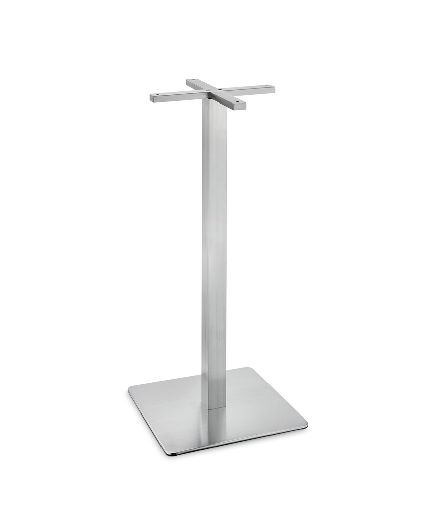 Die solide quadratische Grundplatte bietet die Basis für individuelle Tischlösungen auf kleinstem Raum. Auf der soliden Edelstahlsäule mit Befestigungskreuz können Tischplatten verschiedenster Materialien bis zu einem Maß von max. 800 x 800 mm befestigt werden.