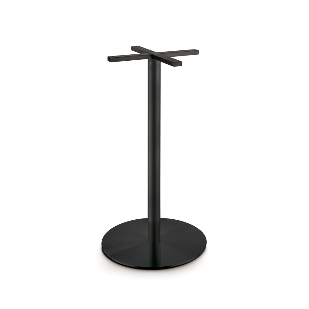 Die solide runde Grundplatte bietet die Basis für individuelle Tischlösungen auf kleinstem Raum. Auf der soliden Edelstahlsäule mit Befestigungskreuz können Tischplatten verschiedenster Materialien bis zu einem Durchmesser von max. 900 mm befestigt werden.