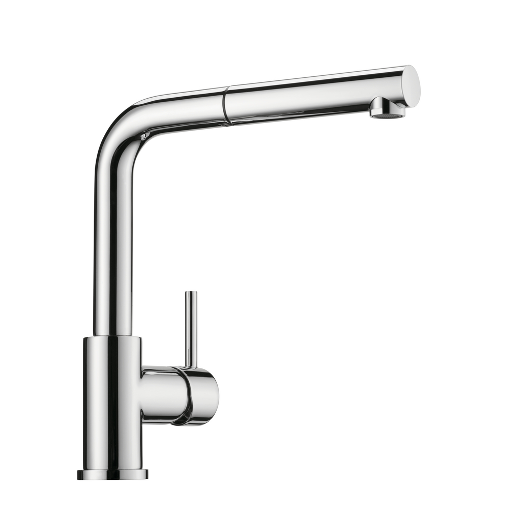 Einhebelmischer. Mit schwenk-/herausziehbarem Auslauf, seitlichem Hebel und Keramikkartusche.