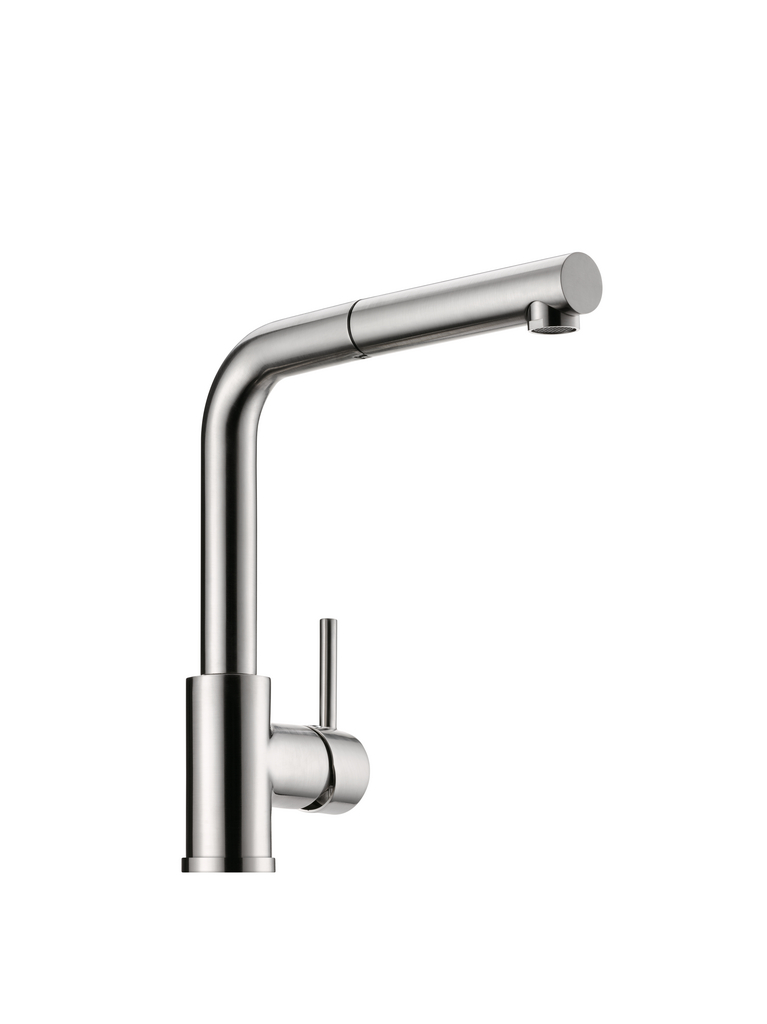 Einhebelmischer. Mit schwenk-/herausziehbarem Auslauf, seitlichem Hebel und Keramikkartusche.