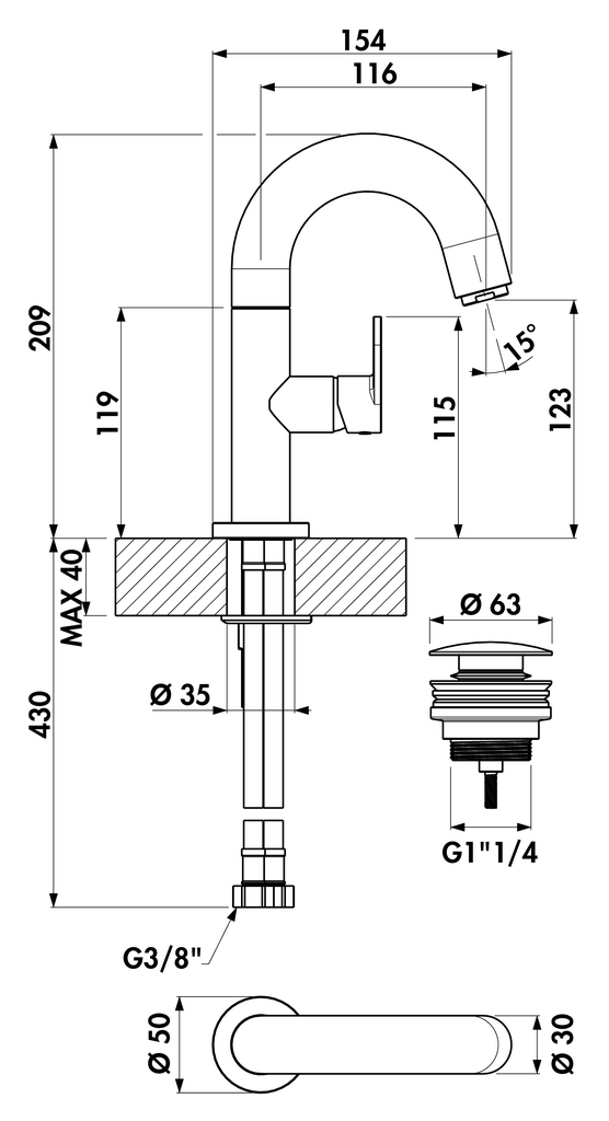 Einhebelmischer. Mit Keramikkartusche. Mit Ablaufgarnitur Klick-Komfort.