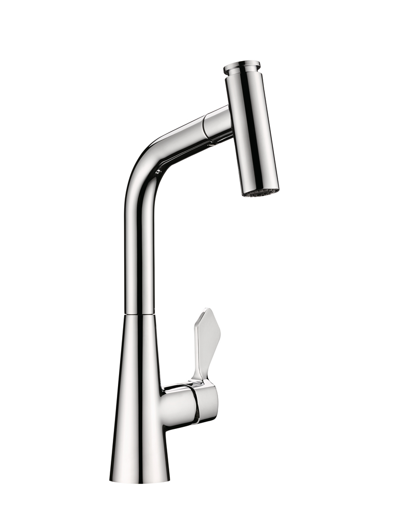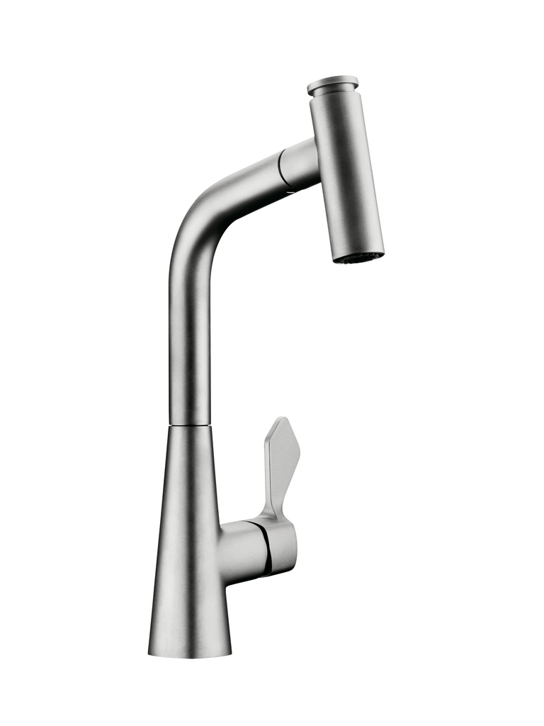 Einhebelmischer. Mit schwenk-/herausziehbarer Schlauchbrause (Strahl/Brause umstellbar), seitlichem Hebel und Keramikkartusche.