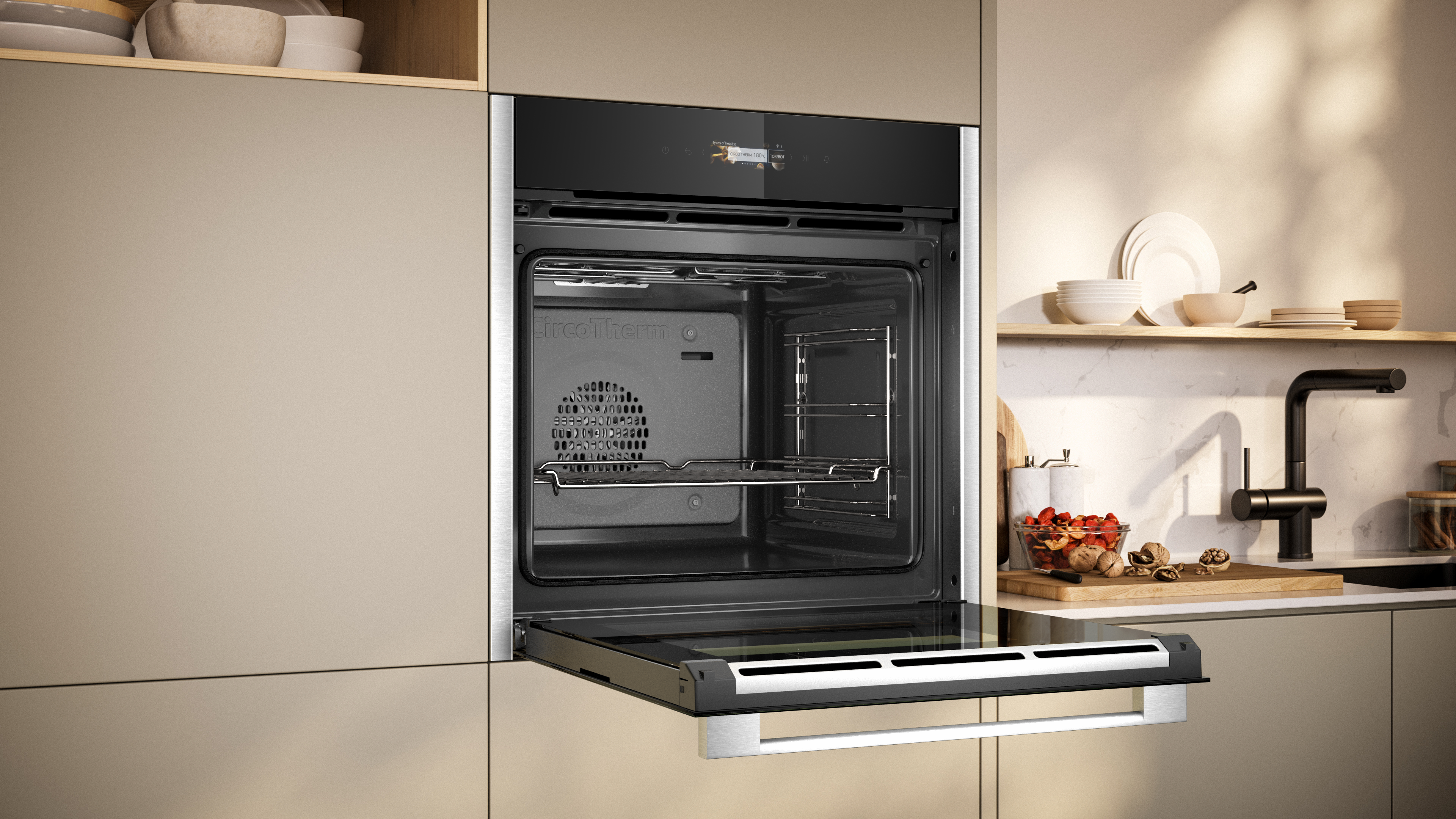 - Backofen mit 14 Beheizungsarten: CircoTherm®, Ober-/Unterhitze, Thermogrill, Großflächengrill, Kleinflächengrill, Pizzastufe, Brotbackstufe 180 °C - 220 °C, Unterhitze, Sanftgaren, Gärstufe, Vorwärmen, Warmhalten, CircoTherm® sanft, Ober-/Unterhitze sanft