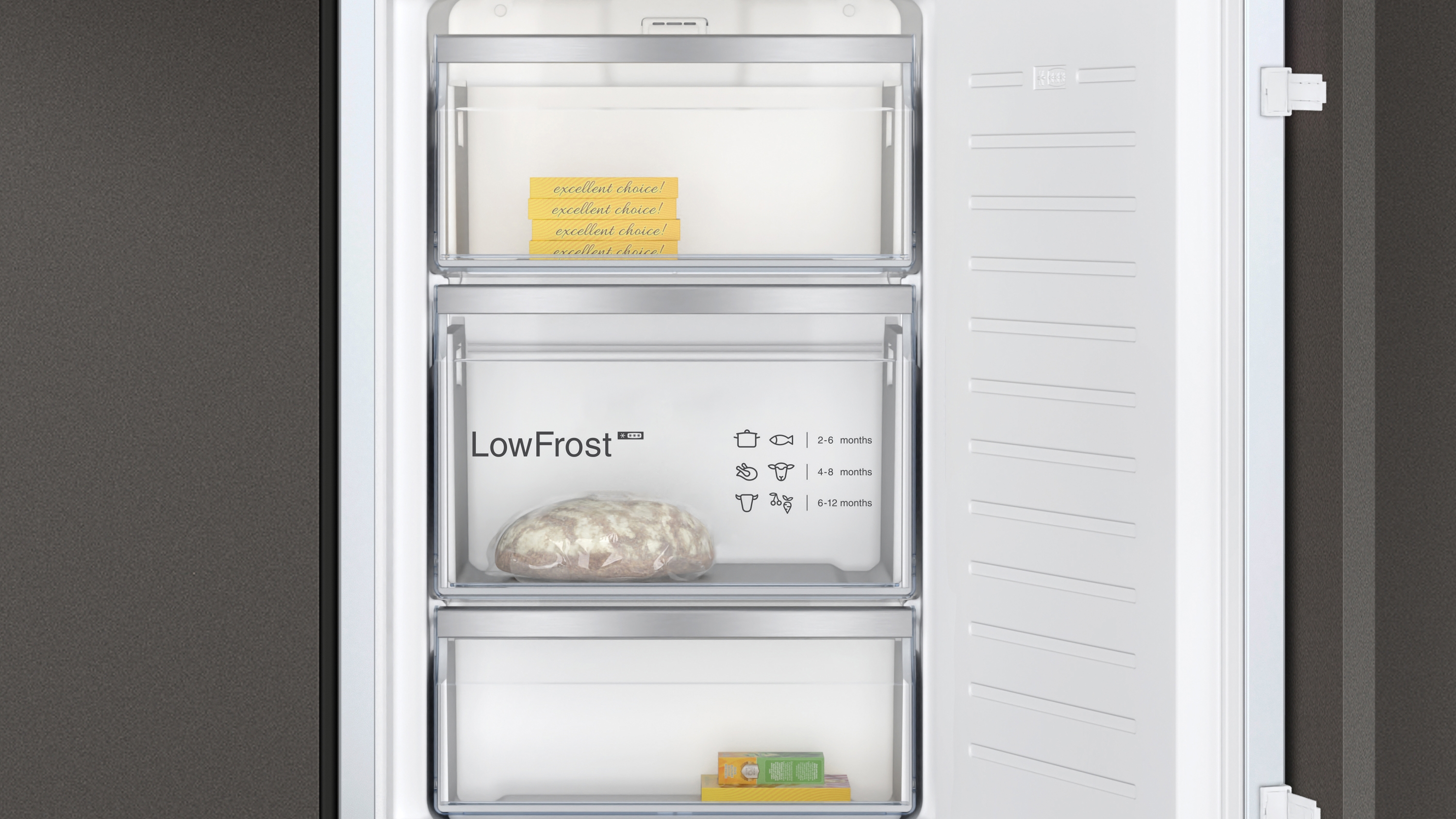 Der Einbau-Gefrierschrank lässt sich besonders leicht abtauen, warnt bei Temperaturanstieg und seine Türen schließen sich sanft von selbst.
