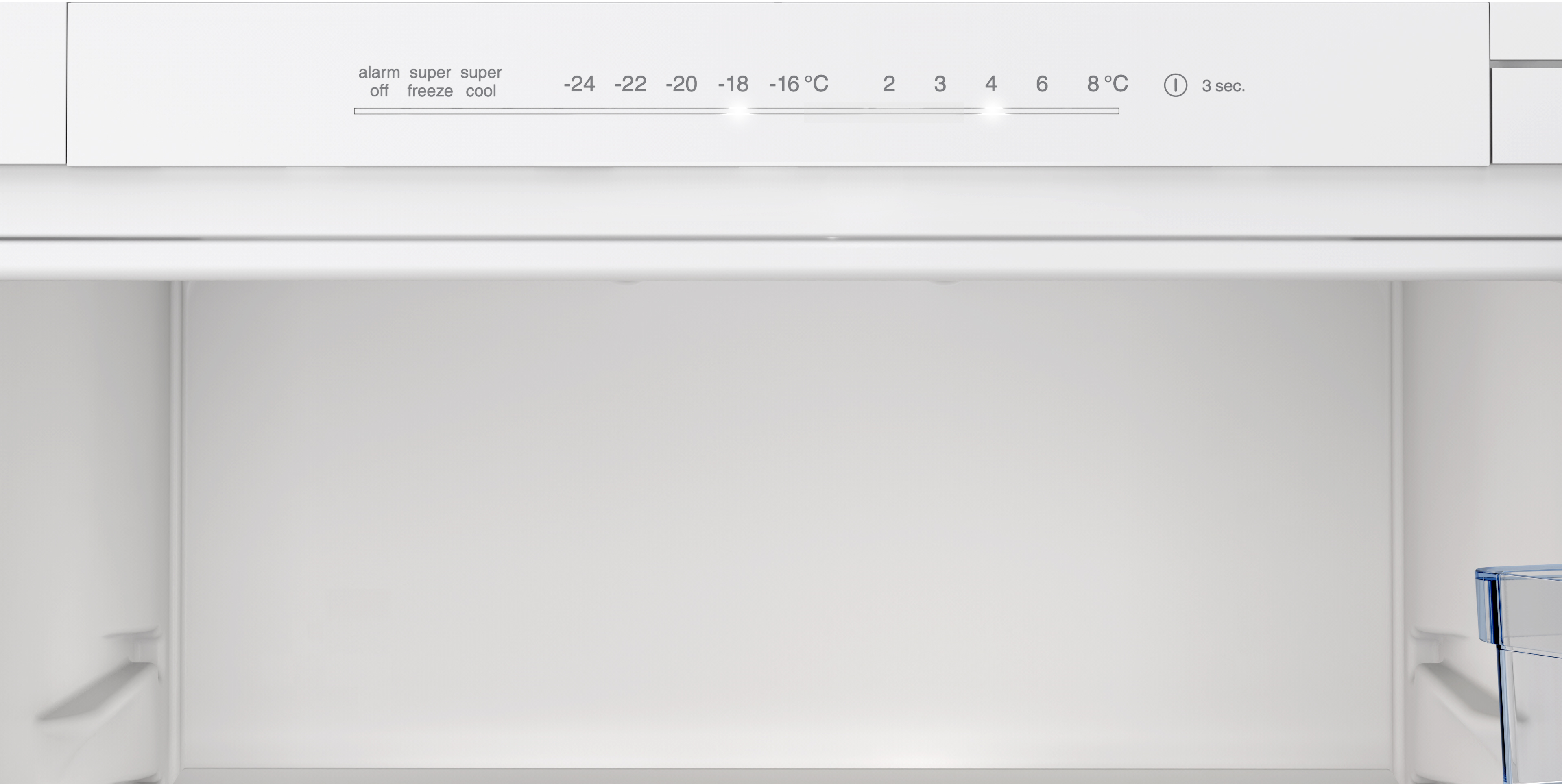 | Bedienelemente: | Superschalter Gefrieren, Superschalter Kühlen, Temperaturanzeige für Kühlen, Warnfunktionen Gefrierteil, Warnsignal Störung Gefrieren, Warnsignal Tür offen |