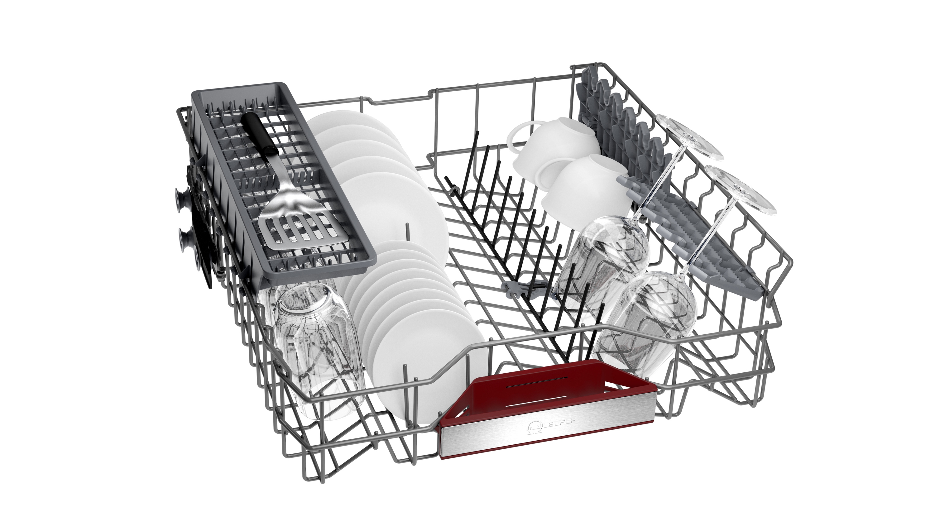 - Klappbare Tellerhaltereihen im Unterkorb (2x)