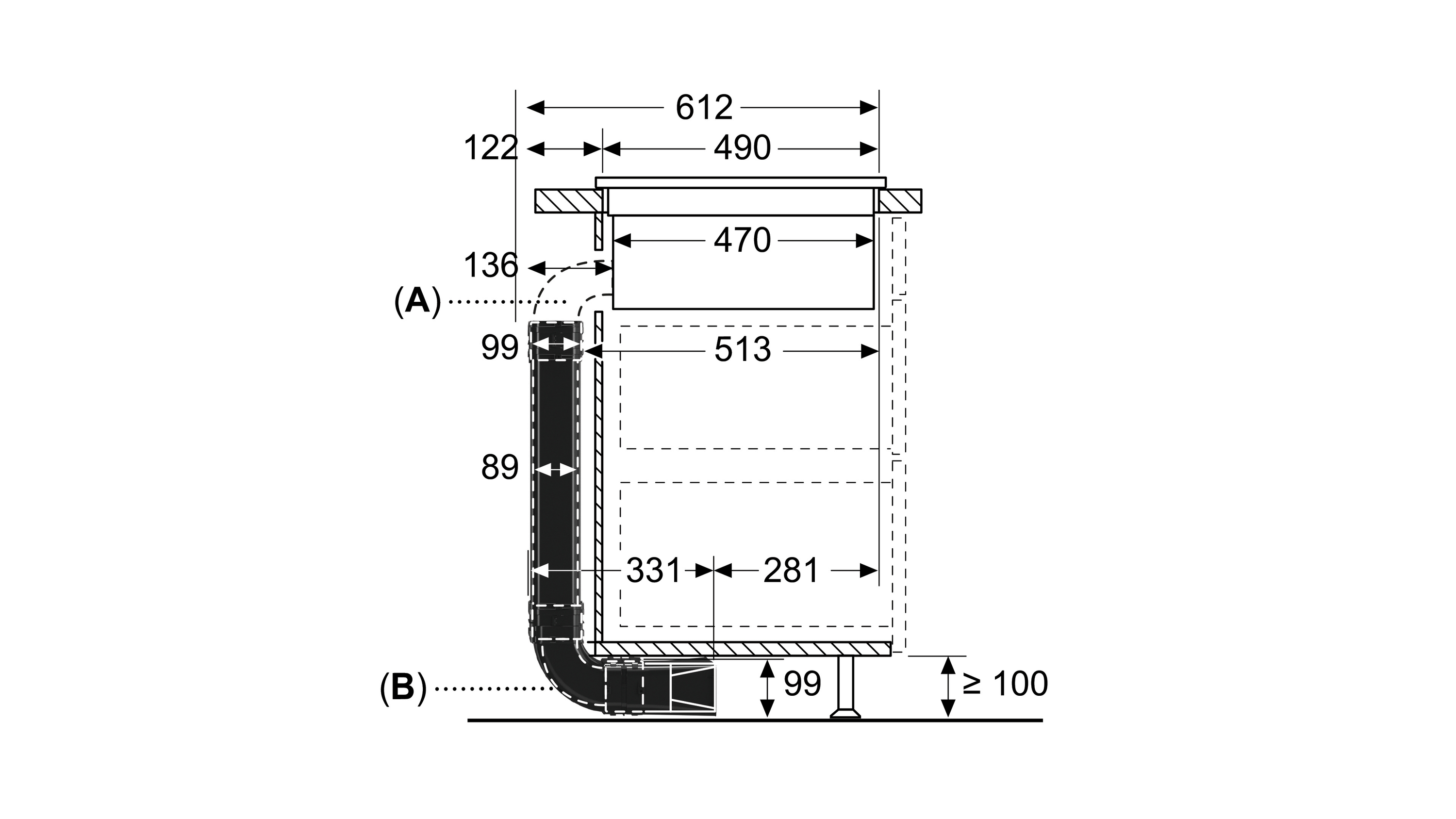 Die Vorzugsverrohrung für die teilgeführte Umluft nur in Kombination mit Kochfeld-Sets inkl. 1. Flachkanalbogen verwenden.