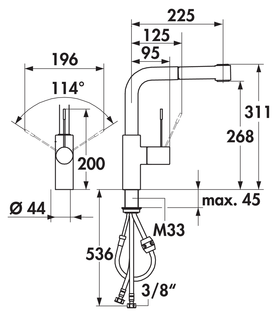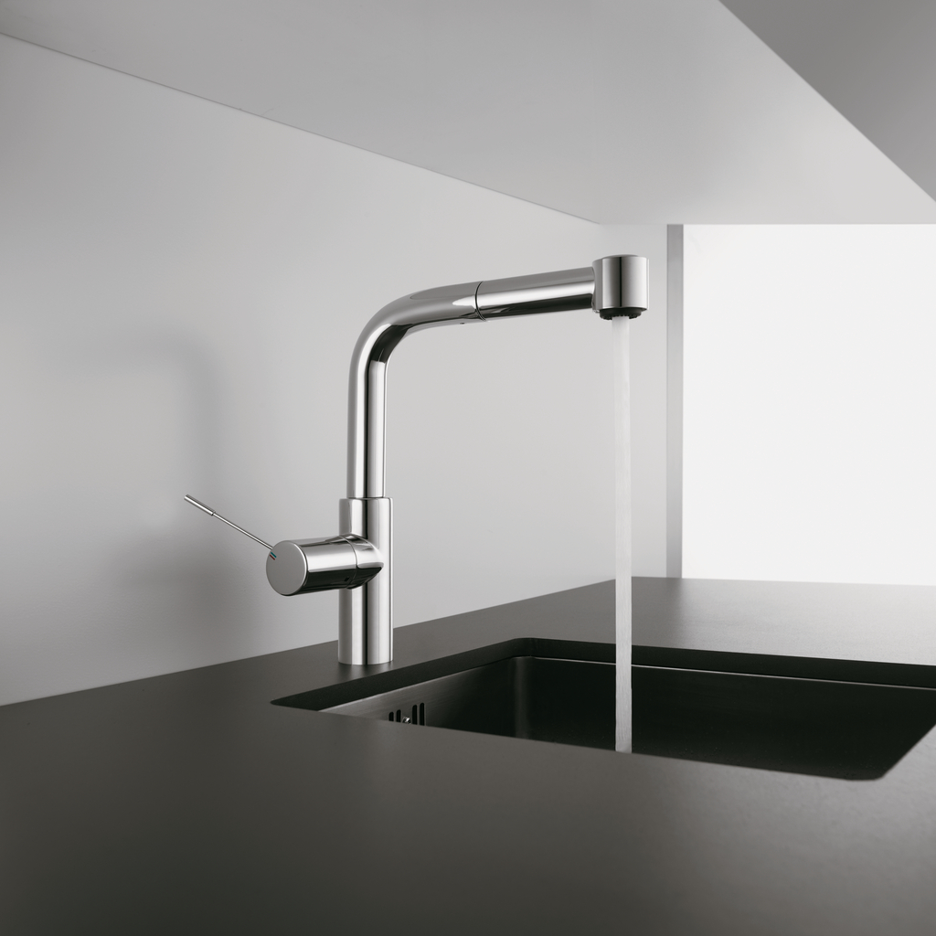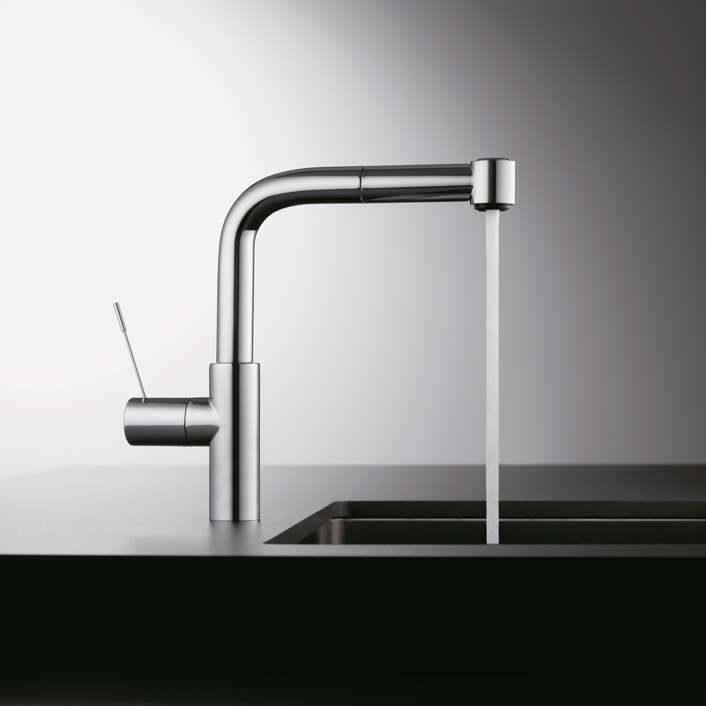 KWC Einhebelmischer. Mit schwenk-/herausziehbarer Schlauchbrause (Strahl/Brause umstellbar), seitlichem Hebel und Keramikkartusche.