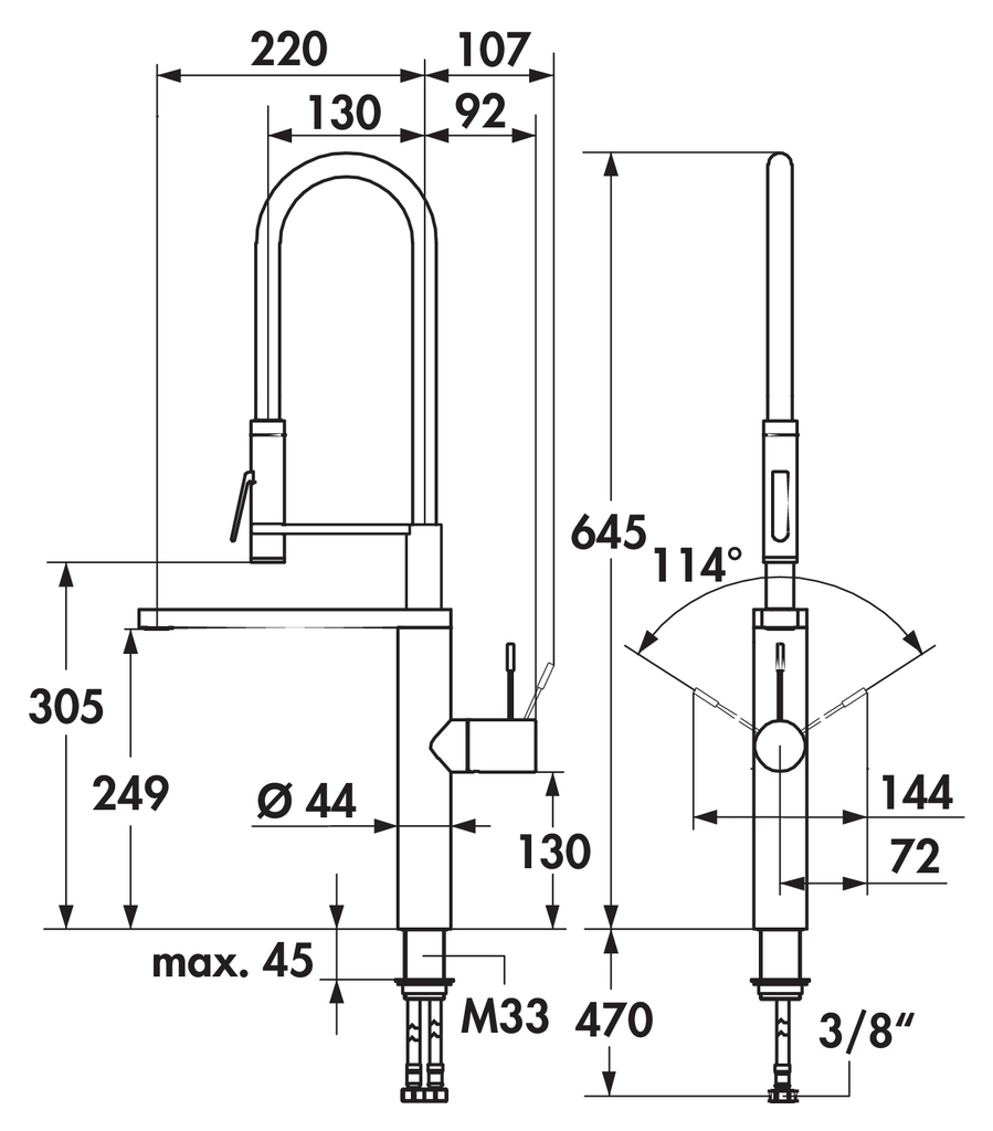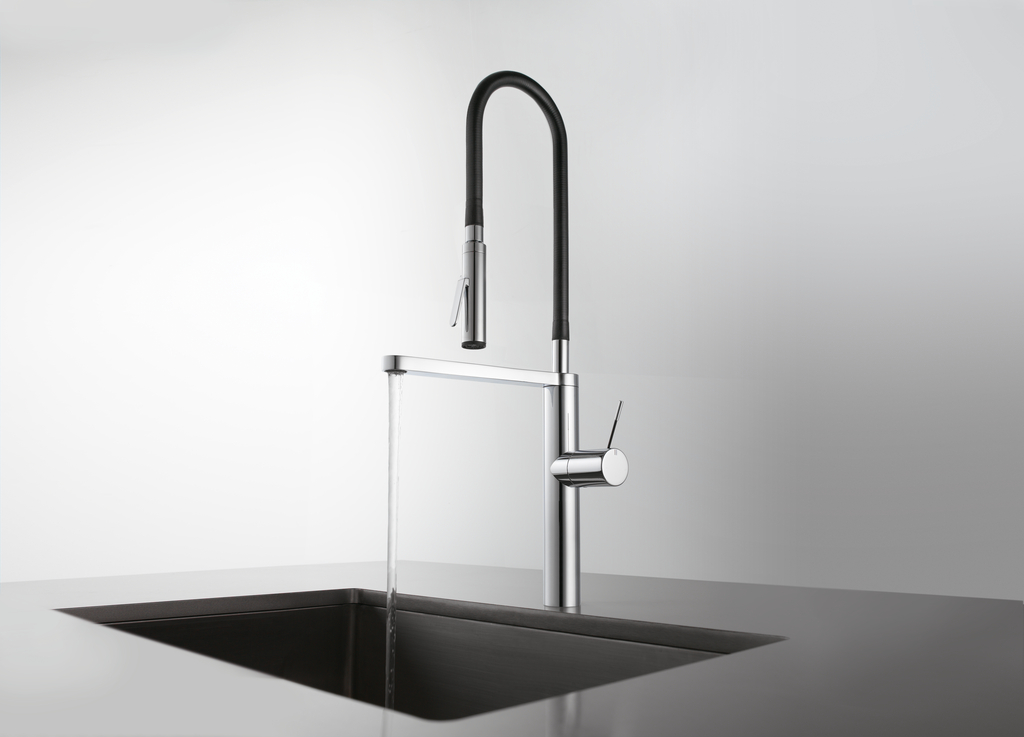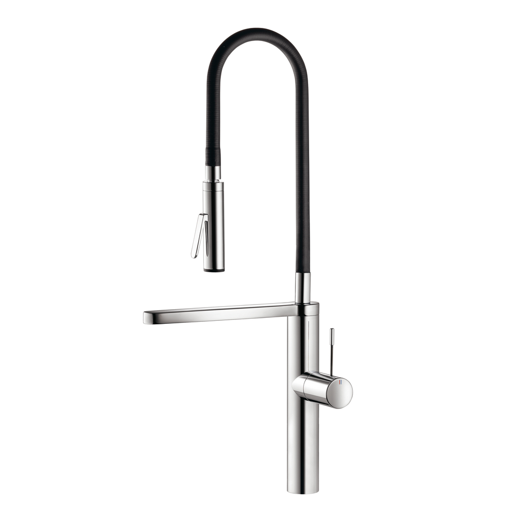 KWC Einhebelmischer. Mit schwenkbarem Auslauf und federgeführter Schlauchbrause, seitlichem Hebel und Keramikkartusche.