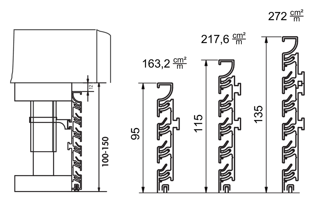 Aluminium-Lamellengitter in den Höhen: 100 / 130 / 150 mm: Lüftungsquerschnitt dementsprechend ca. 163,2 / 217,6 / 272 cm²/m