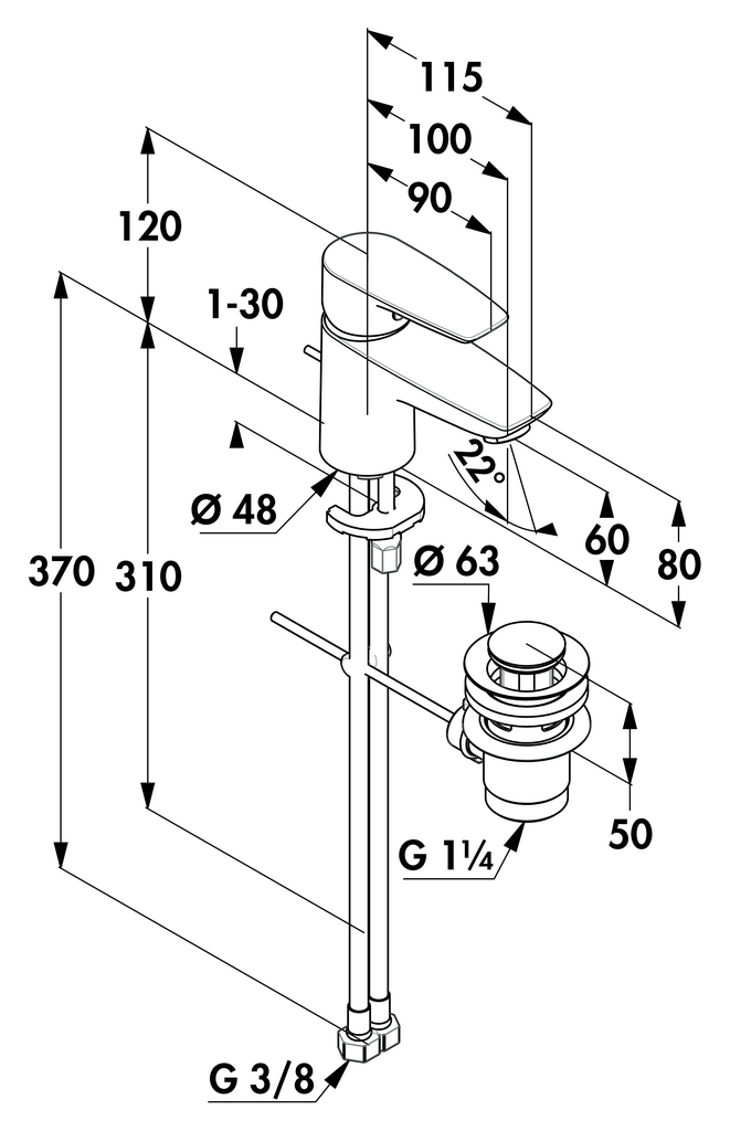 Kludi Einhebelmischer. Mit Zugstangen-Ablaufgarnitur 1¼" und Keramikkartusche.