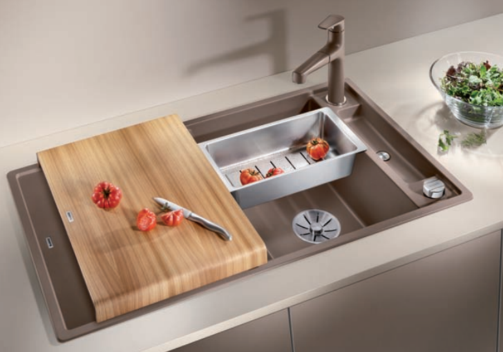 SILGRANIT® PuraDur®, in verschiedenen Farben erhältlichmit Holz- oder Glasschneidbrett (wählbar)mit Ablauffernbedienung