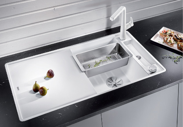 Lieferumfang:Esche-Compound-Brückenschneidbrett (234051) oder Glasschneidbrett weiß (234045) , Multifunktionsschale aus Edelstahl (233739), Ablaufgarnitur mit Raumsparrohr, zwei 3 1/2'' InFino®-Korbventile, Ablauffernbedienung für das Hauptbecken