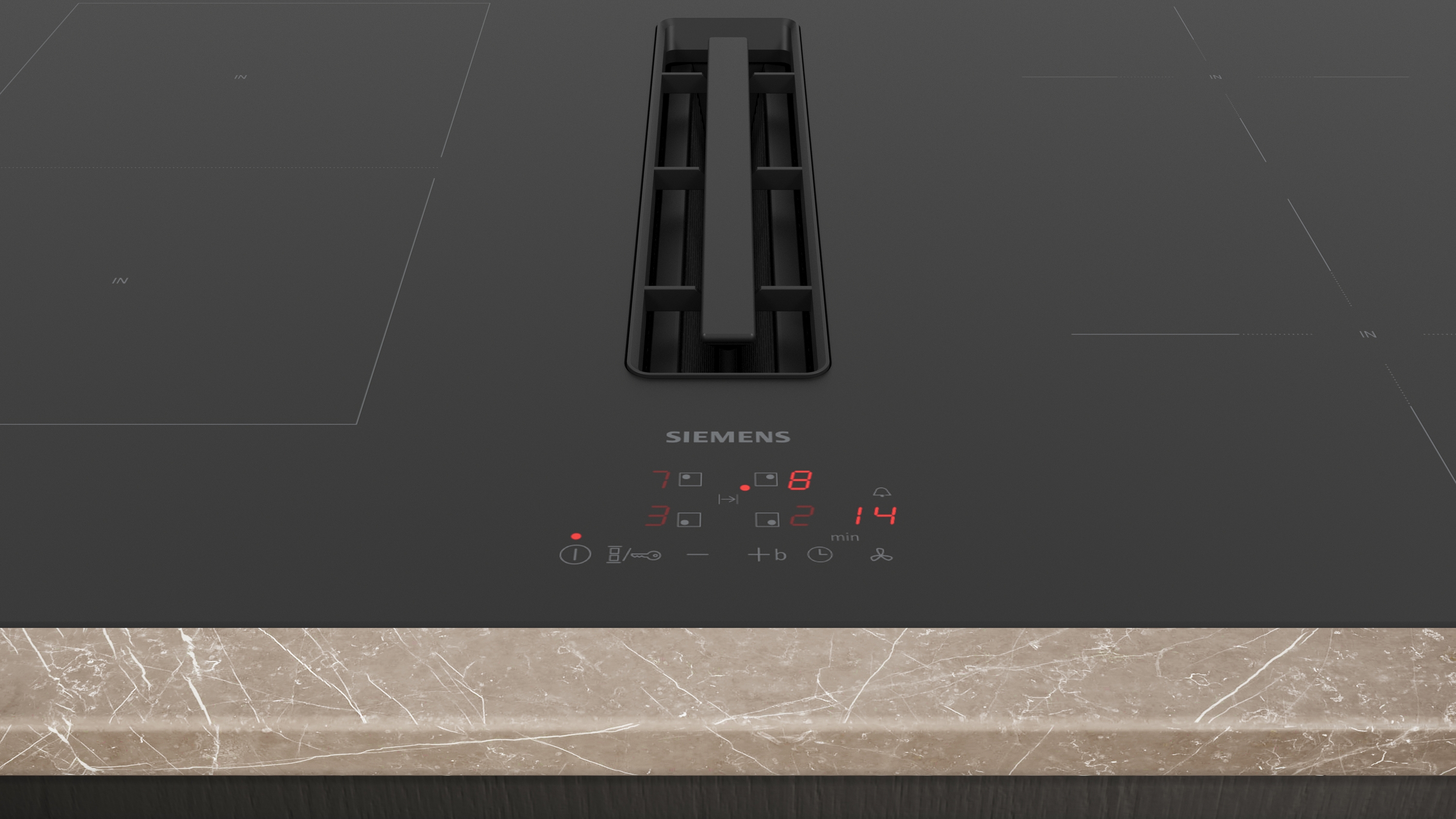 - Induktionskochfeld mit vollintegriertem, leistungsstarkem Downdraft-Abzugsmodul.