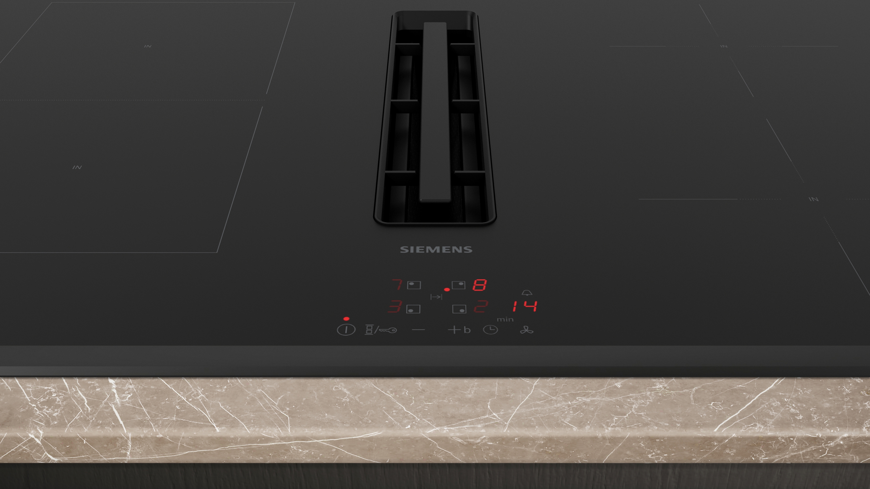 - Induktionskochfeld mit vollintegriertem, leistungsstarkem Downdraft-Abzugsmodul.