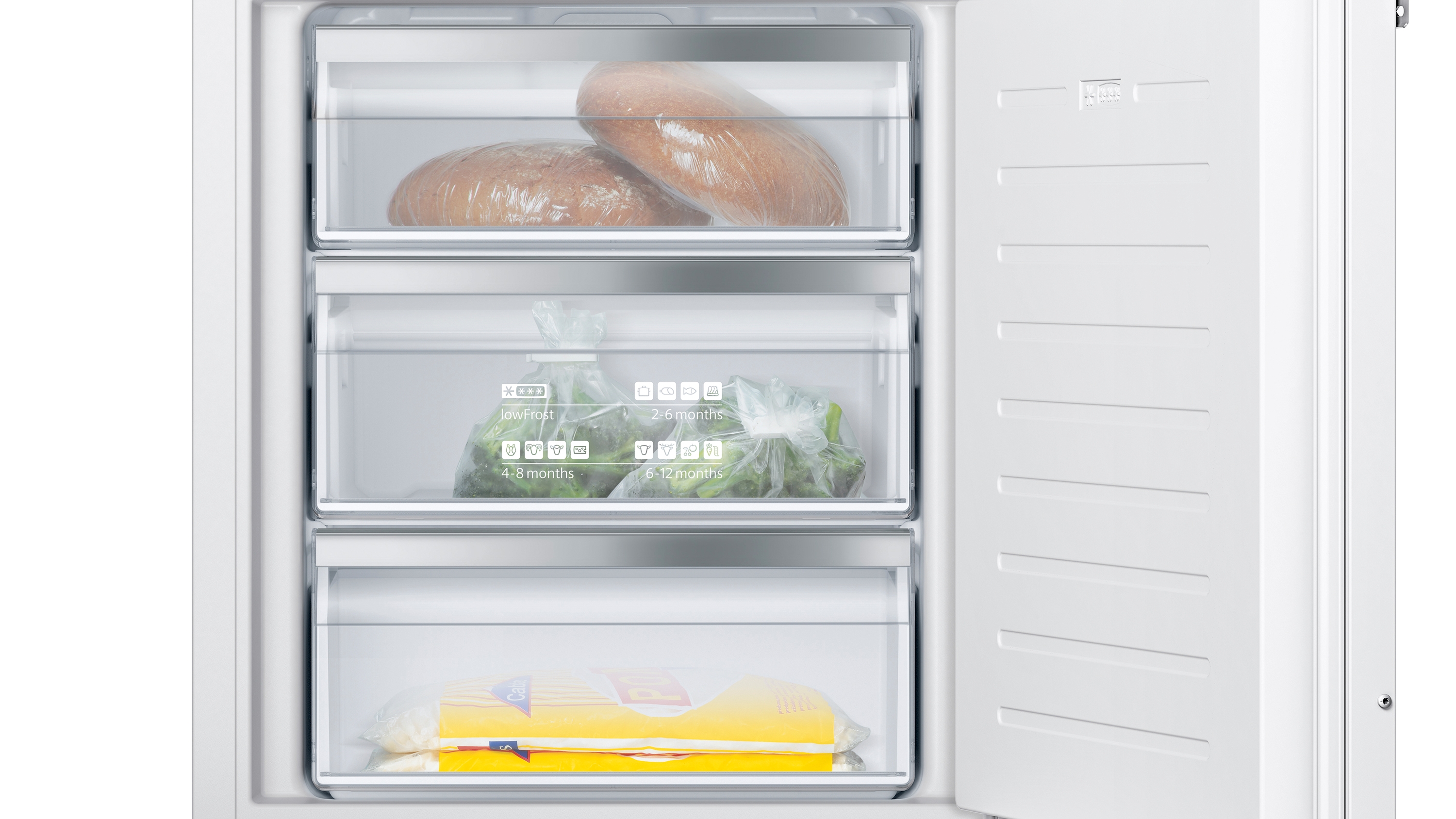 Einbau-Gefrierschrank mit 3 praktischen transparenten Gefriergutschubladen und superFreezing für schnelleres Einfrieren.