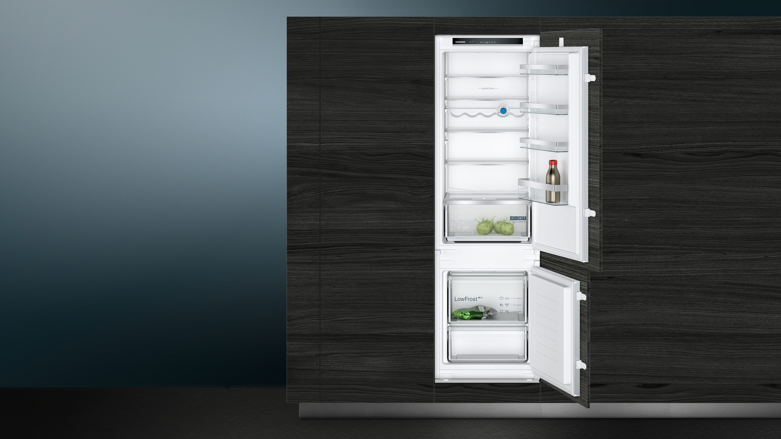 Einbau Kühl-Gefrierkombination mit hyperFresh, um Obst und Gemüse, länger frisch zu halten. Mit einer hellen LED Beleuchtung für eine brilliante Beleuchtung im Kühlschrankinneren.
