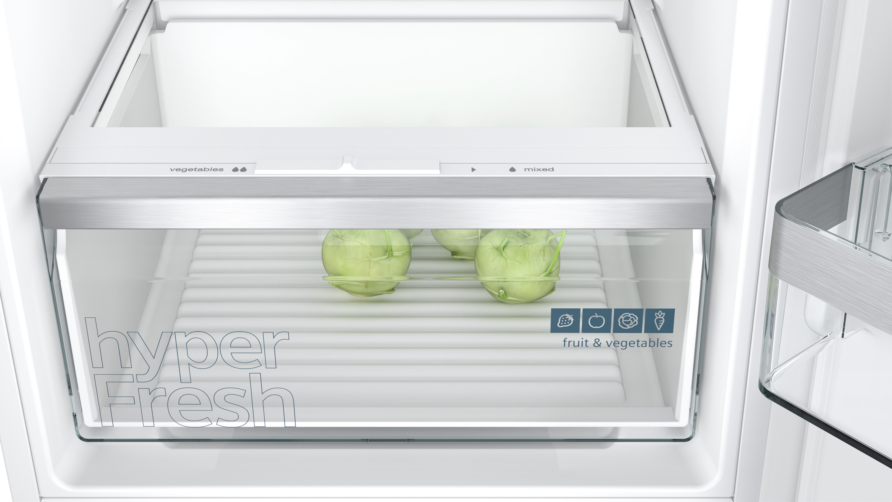 Obst und Gemüse bleiben in der hyperFresh Schublade dank Feuchtigkeitsregler länger frisch