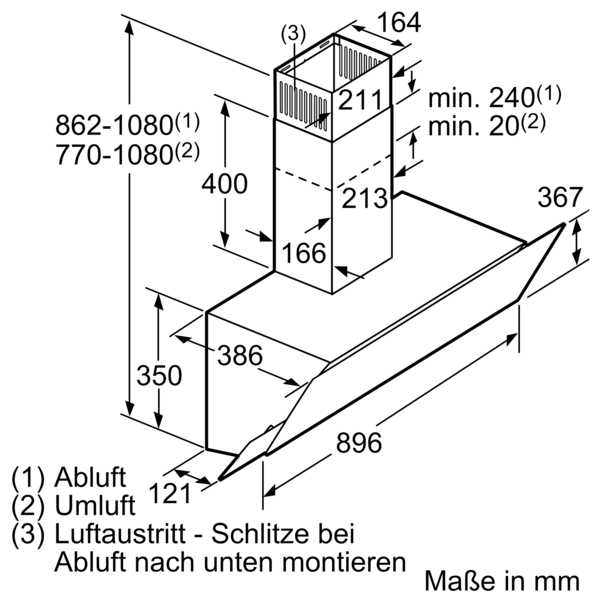 - Gerätemaße Abluft (HxBxT): 750-1080 x 896 x 386 mm
