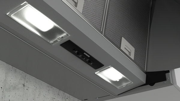 Die nach vorn aufklappbare Zwischenbauhaube mit hoher Absaugleistung für kraftvolle Performance ist unsichtbar in die Oberschrankzeile eingebaut.