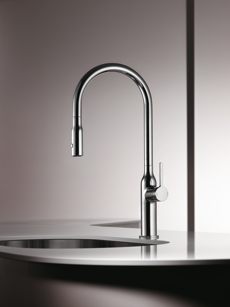 KWC Einhebelmischer. Mit schwenk-/herausziehbarer Schlauchbrause (Strahl/Brause umstellbar), mit seitlichem Hebel und Keramikkartusche.