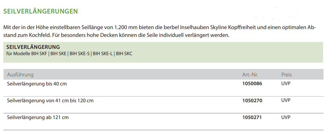 Seilverlängerung für Inselhauben Skyline Für die Serie der Inselhauben Skyline bietet berbel verschiedene Seilverlängerungen für besonders hohe Räume an.