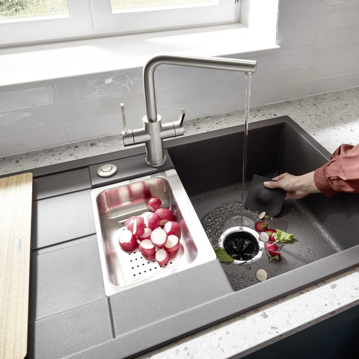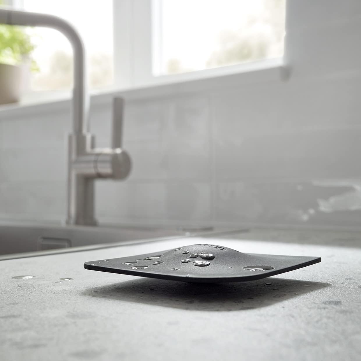 - Mit den glatten Seiten einfach Küchenreste, Schmutz und Wasser von der Arbeitsplatte oder der Spüle wischen