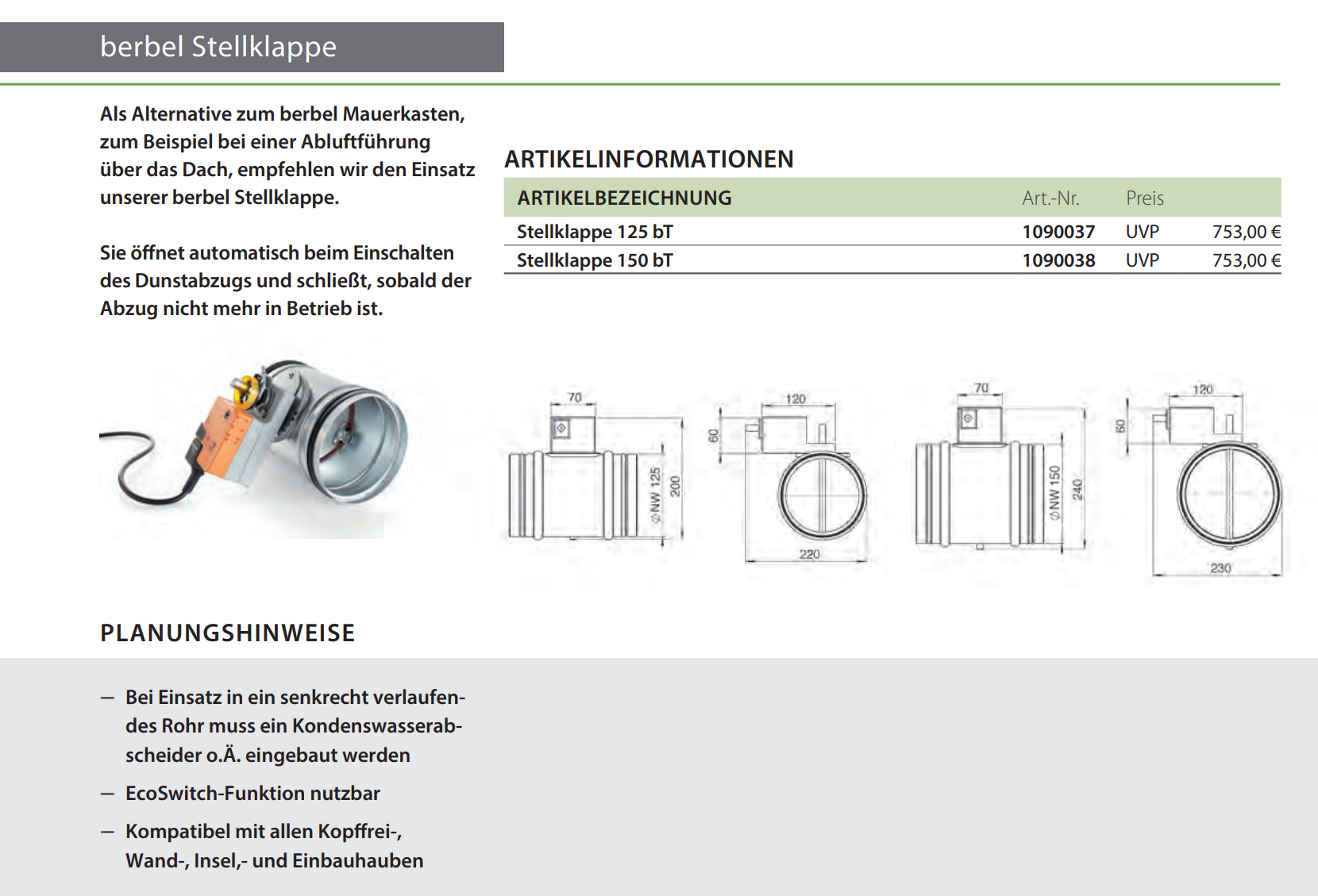 Als Alternative zum berbel Mauerkasten, zum Beispiel bei einer Abluftführung über das Dach, empfehlen wir den Einsatz unserer berbel Stellklappe. Sie öffnet automatisch beim Einschalten des Dunstabzugs und schließt, sobald der Abzug nicht mehr in Betrieb ist.