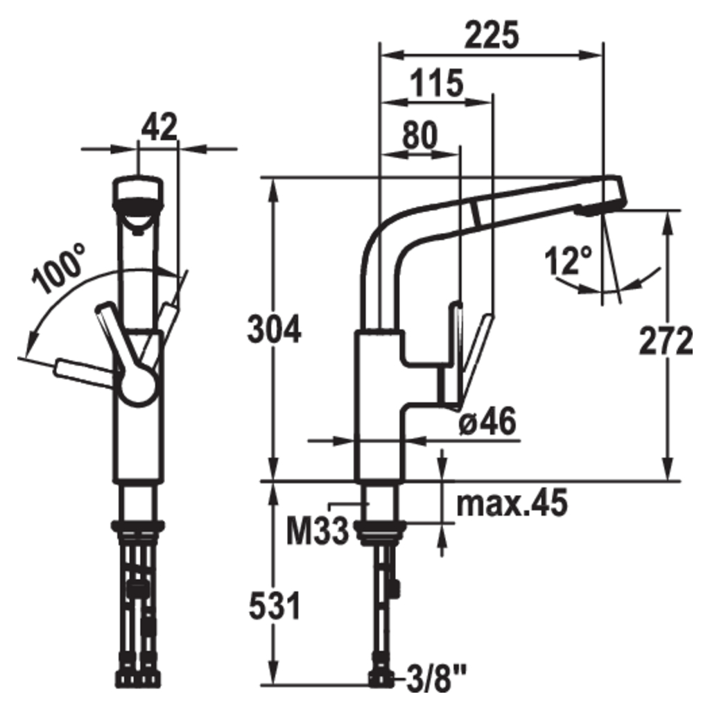 KWC Einhebelmischer. Mit schwenk-/herausziehbarer Schlauchbrause (Strahl/Brause umstellbar), seitlichem Hebel und Keramikkartusche.