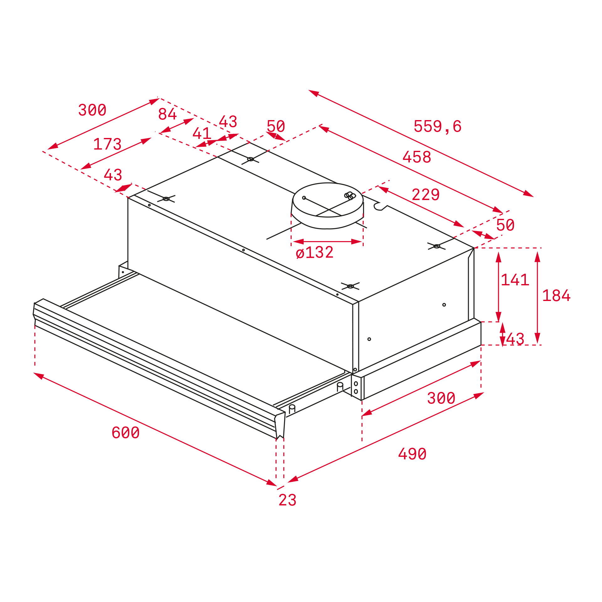 - Abmessungen: max. 184 x 600 x 300/490 mm