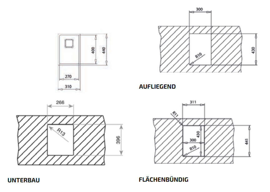 - 3in1 Flexinstallation für Unterbau, aufliegenden oder flächenbündigen Einbau