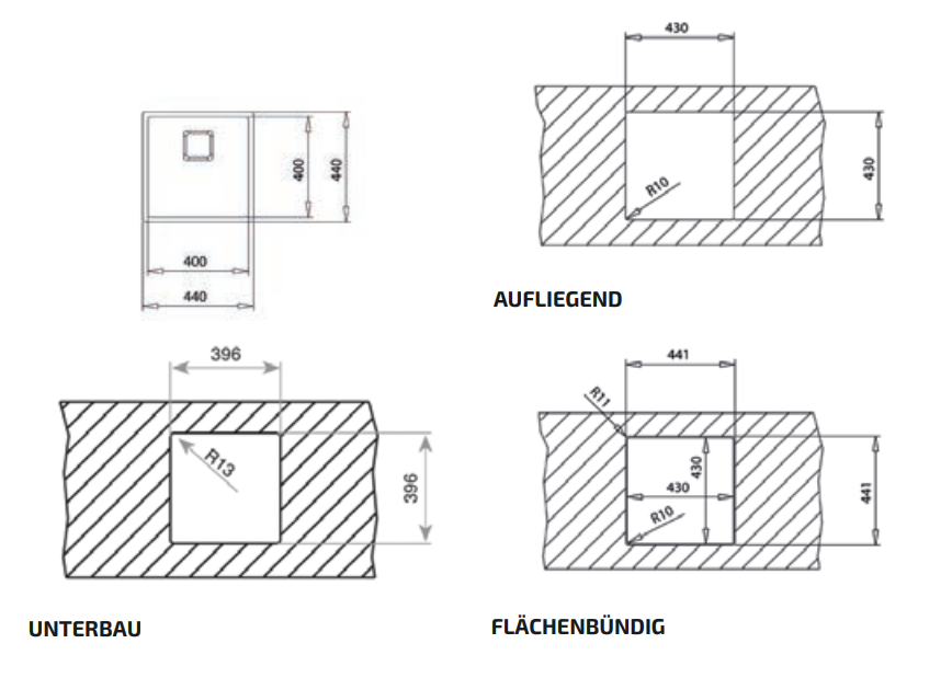 - 3in1 Flexinstallation für Unterbau, aufliegenden oder flächenbündigen Einbau