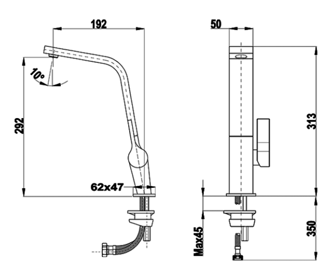 Platzsparende, mittige Hebelstellung direkt über dem Auslauf Auslaufsmenge Normalstrahl: 11,4 l/min. (3 bar) Flexible Anschlussschläuche mit 450 mm Länge und 3/8 Überwurfmutter DVGW zertifiziert