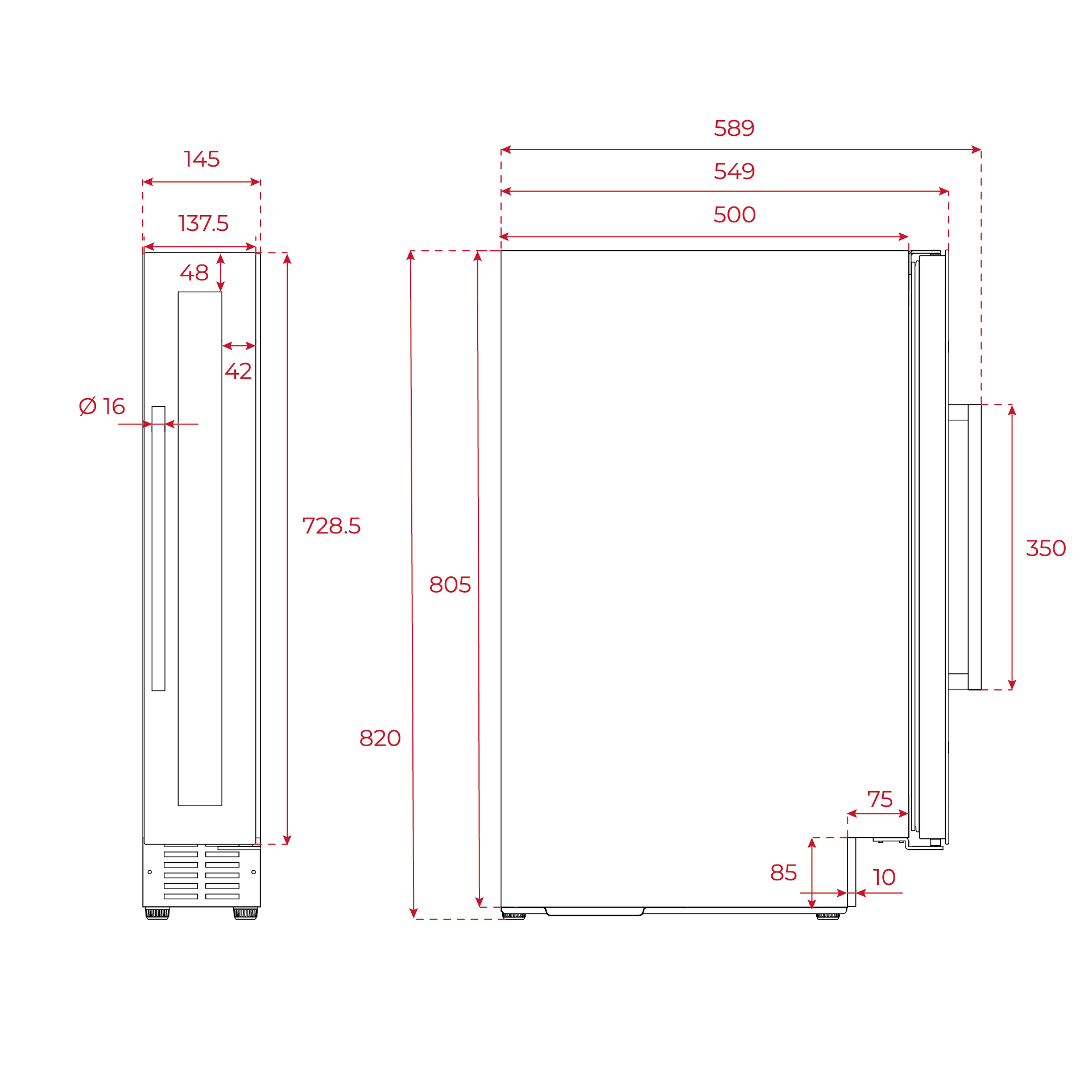 - Höhe (mm): 820 / Breite (mm): 145 / Tiefe (mm): 549