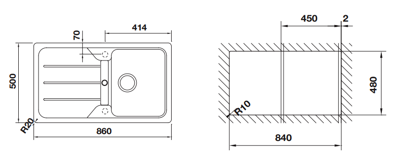- Arbeitsplattenausschnitt LxB ca. 840x480 mm
